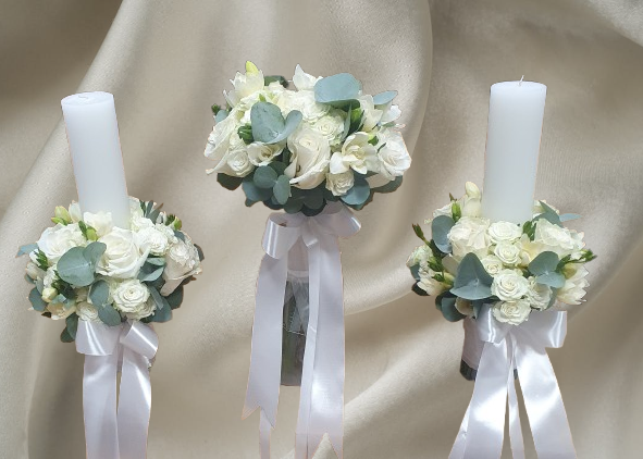 Set Buchet de mireasa/cununie + lumanari cununie din flori naturale